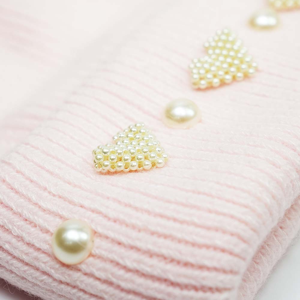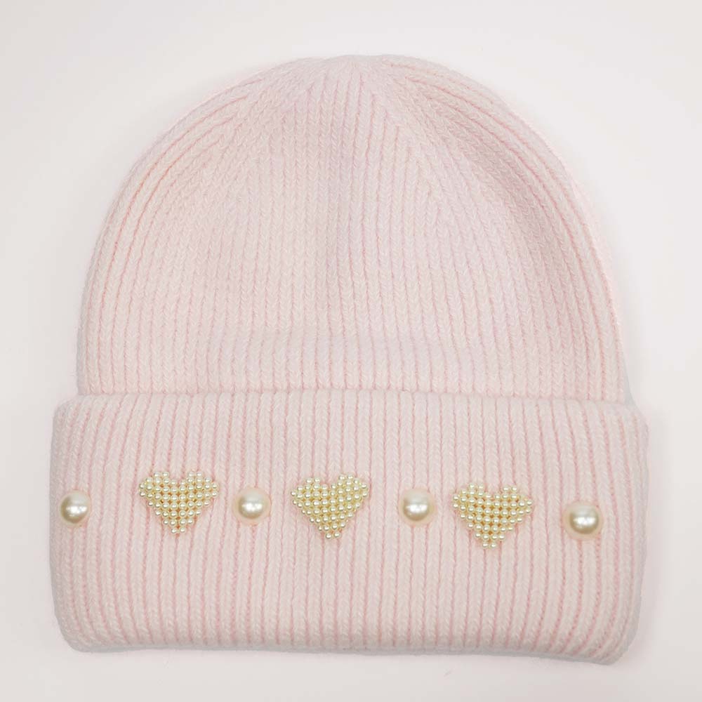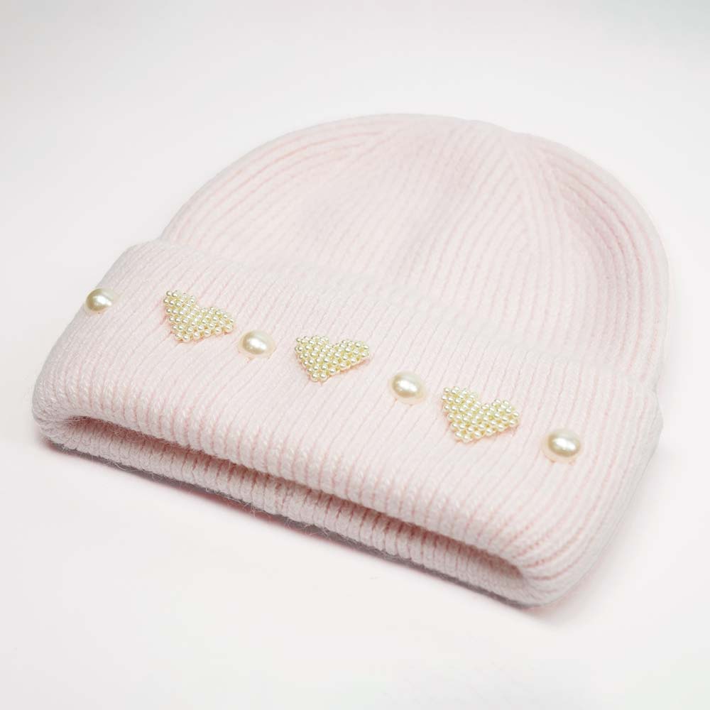 Ribbed Wool Beanie with Pearls & Heart Embellishments - Light Pink