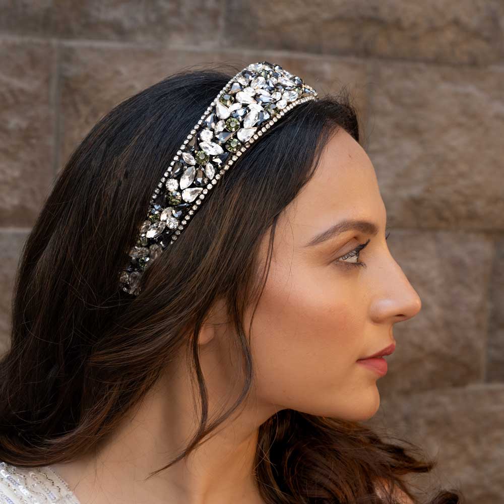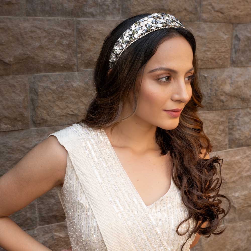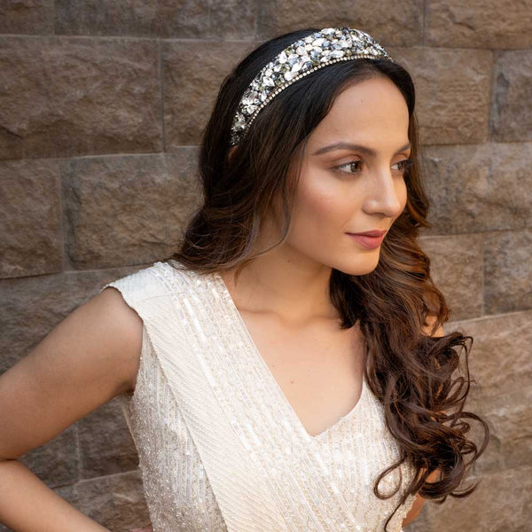 Ready to amp up your casual look? Get your hands on our rosemary hair band! This beautiful handcrafted hair accessory is comfortable and functional. What makes it special is that the entire hairband is made using blingy-est crystals and intricate handwork, taking it's beauty up a notch. Pair it with a your indian wear for a festive vibe or a cocktail dress for a chic one.