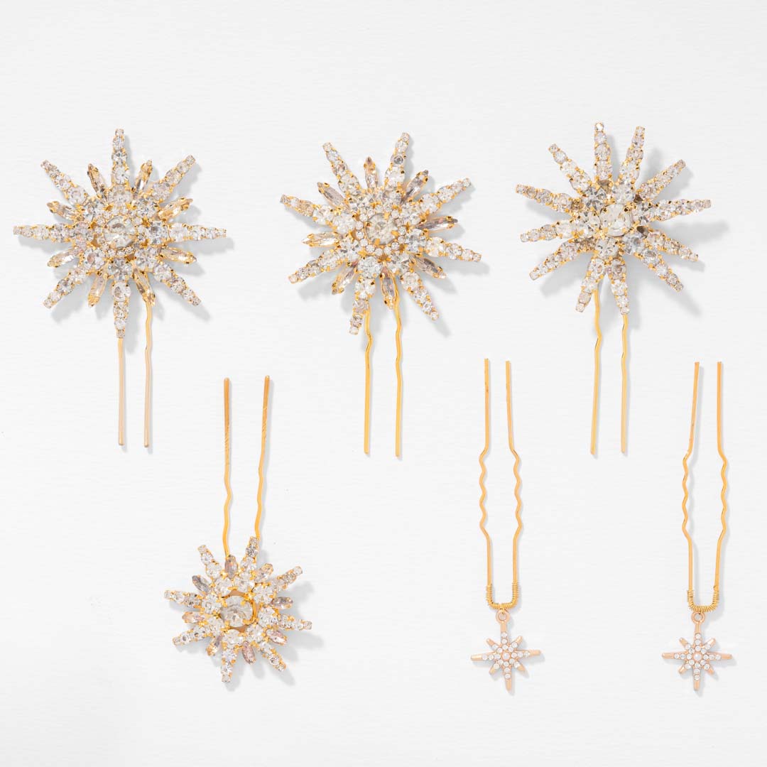 Woman with decorative hairpins against a blurred background of lightsSet of six gold hairpins with star-shaped decorative ends on a light gray backgroundWoman with intricate hair styling and decorative hairpins against a neutral curtain backgroundSet of gold and pearl hairpins on a white background
