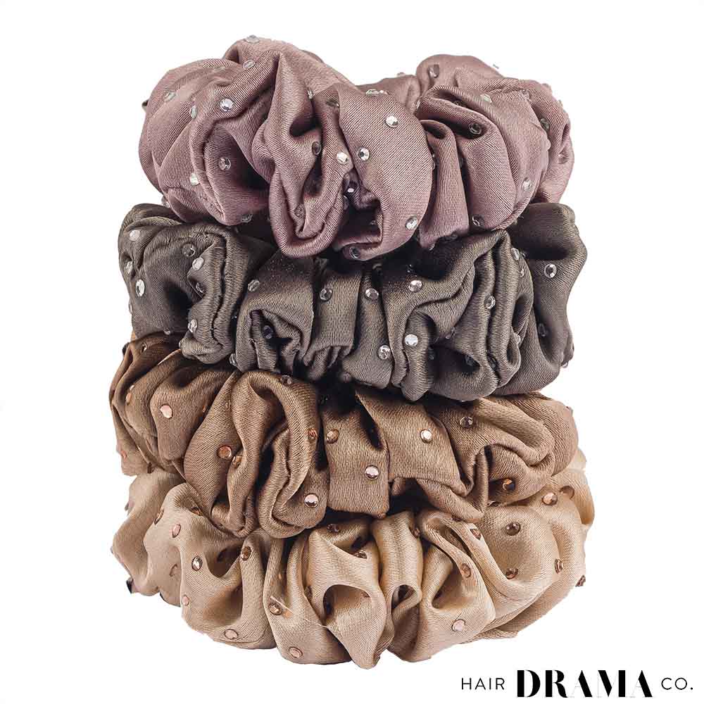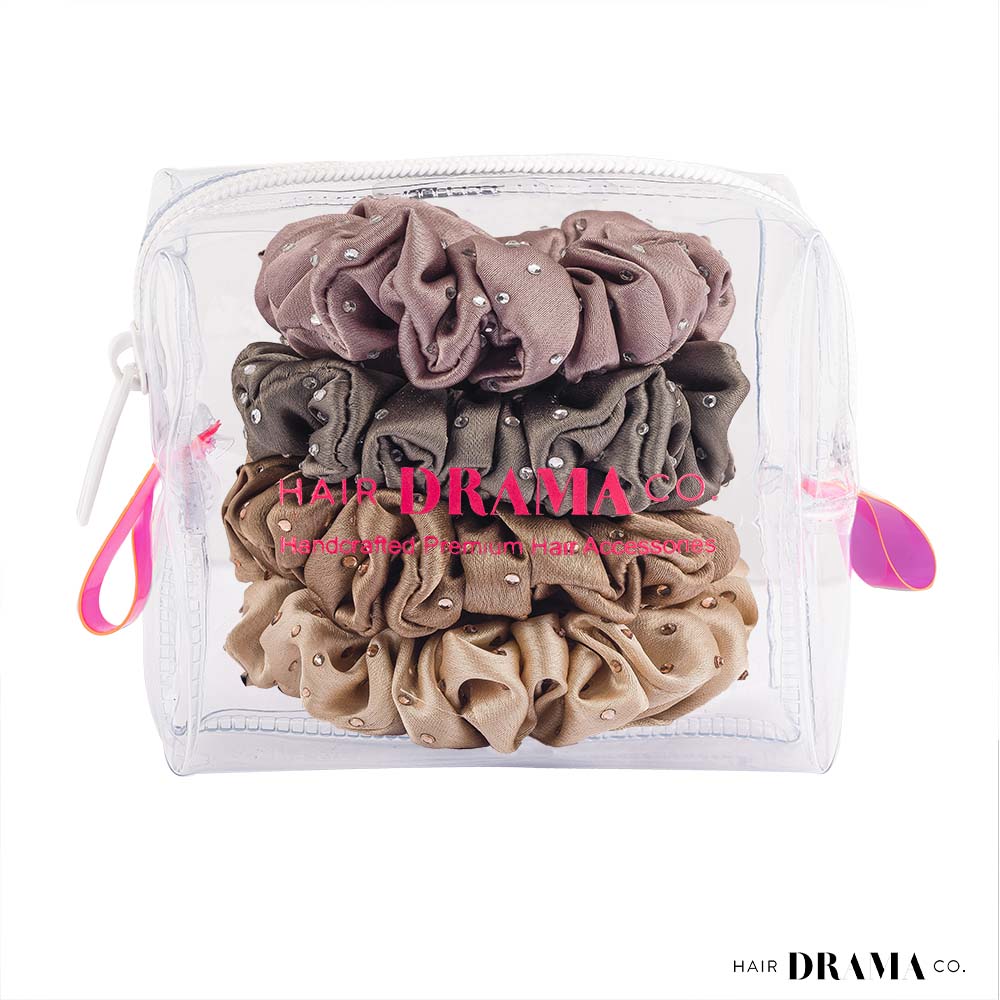 Luxury Scrunchies Set of 4 with Free Pouch - Neutral Crystal Gift Set