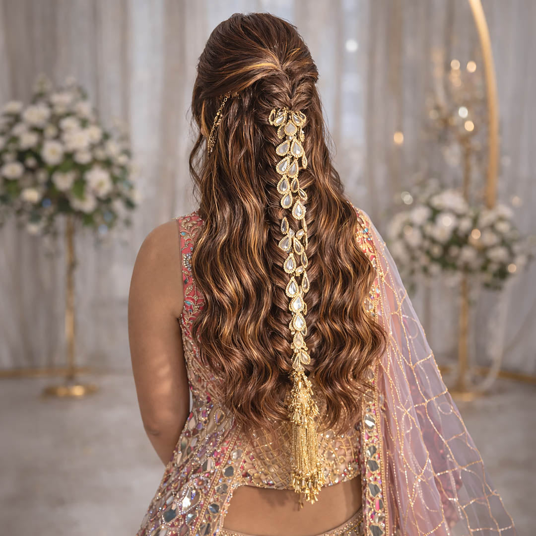 Mirror Lace Parandi is a statement bridal hair accessory designed to transform any hairstyle into a sparkling moment. Crafted with cascading mirror-embellished lace, this elegant parandi hair accessory trails beautifully down the hair while remaining lightweight and comfortable to wear. The piece finishes with a rich beaded tassel that adds graceful movement and a regal touch. Simply wrap or braid it into your hair to instantly elevate braids, ponytails, or half-up styles, making it a beautiful bridal parandi and Indian wedding hair accessory for festive and bridal looks.