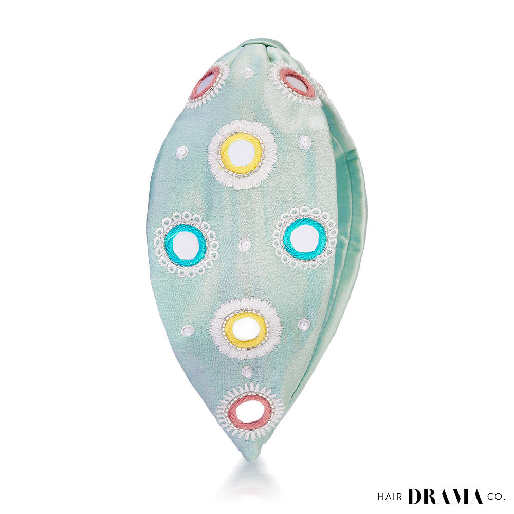 This knotted headband is the perfect hair accessory with hand embroidered mirrorwork to take your ethnic look up a notch.