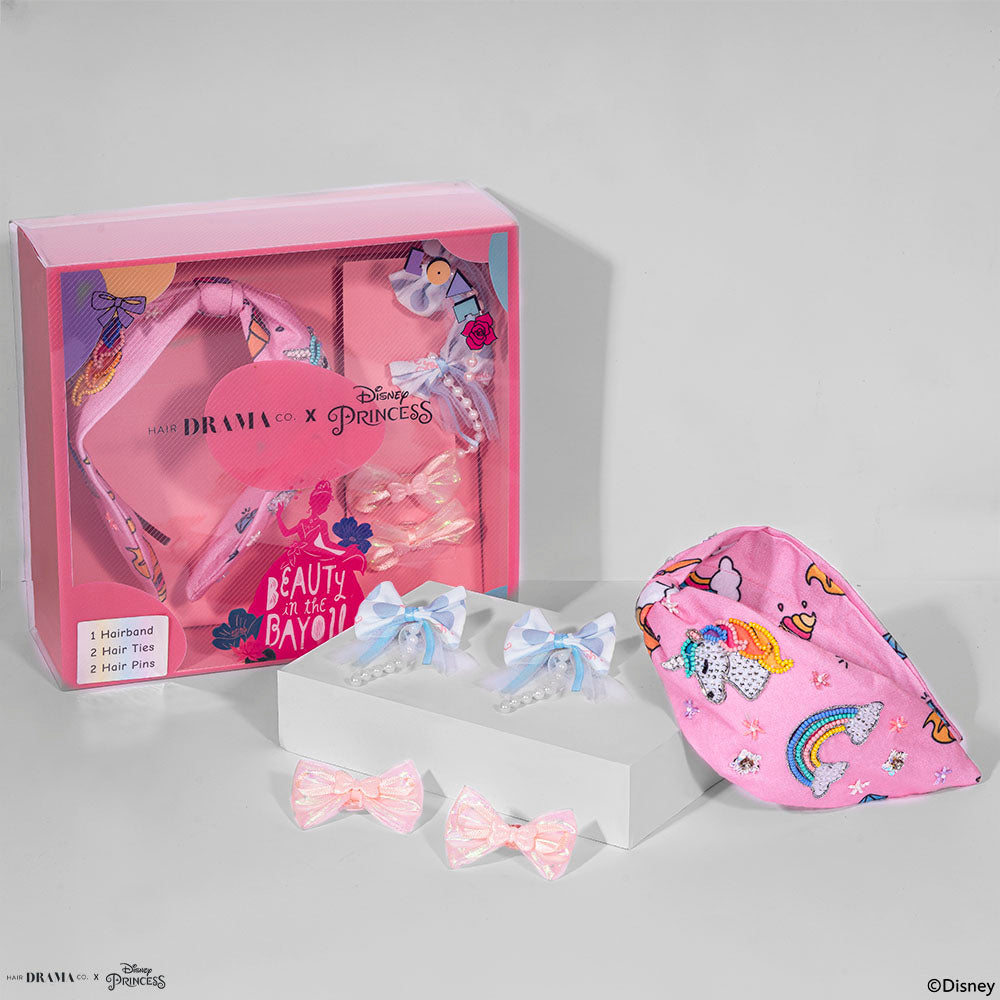 This is our Unicorn themed Gift Box which contains 1 Unicorn Knotted Headband in pink color, 2 multi-colored Hair Pins and 2 multi-colored Holographic Hair Ties. All of this comes in a giftable box!