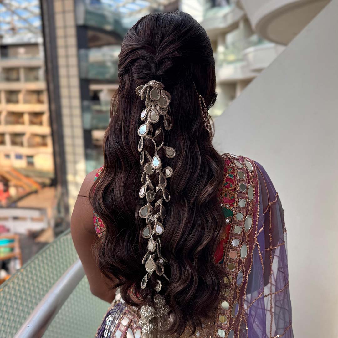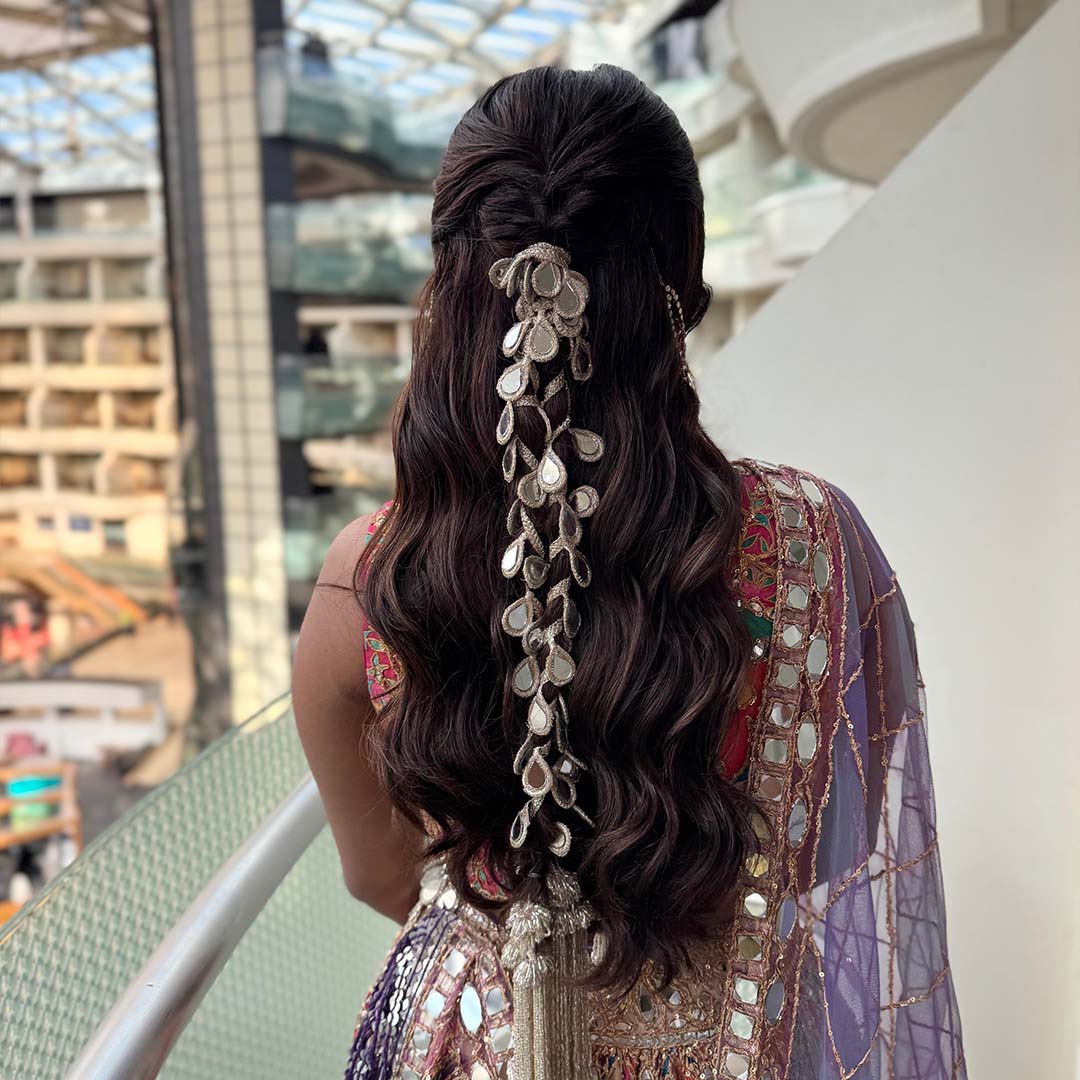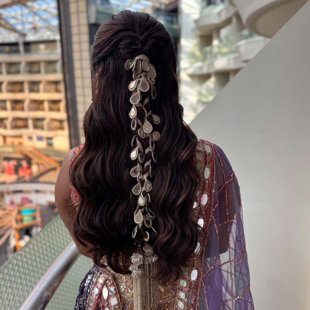 Mirror Lace Parandi is a statement bridal hair accessory designed to transform any hairstyle into a sparkling moment. Crafted with cascading mirror-embellished lace, this elegant parandi hair accessory trails beautifully down the hair while remaining lightweight and comfortable to wear. The piece finishes with a rich beaded tassel that adds graceful movement and a regal touch. Simply wrap or braid it into your hair to instantly elevate braids, ponytails, or half-up styles, making it a beautiful bridal parandi and Indian wedding hair accessory for festive and bridal looks.