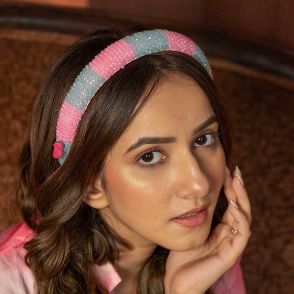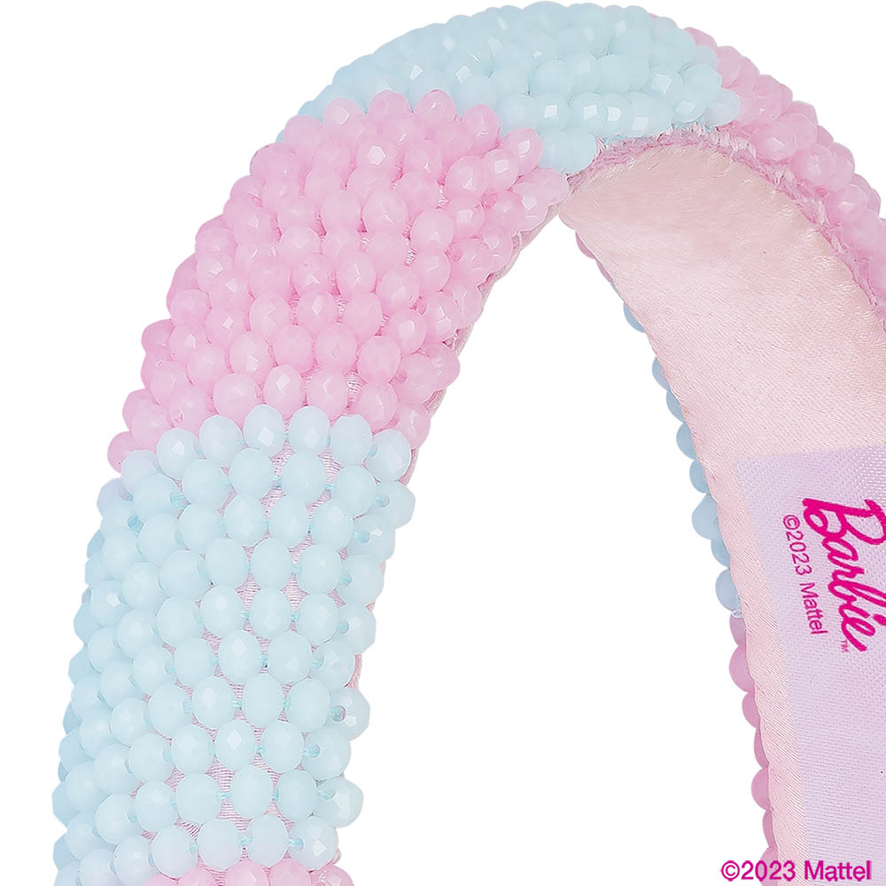 - Glam but make it Barbie! This embellished hair band is a blend of playfulness and sophistication. Made with silk satin material and adorned with pink & blue crystals this hair accessory is for you!