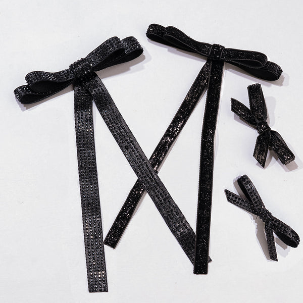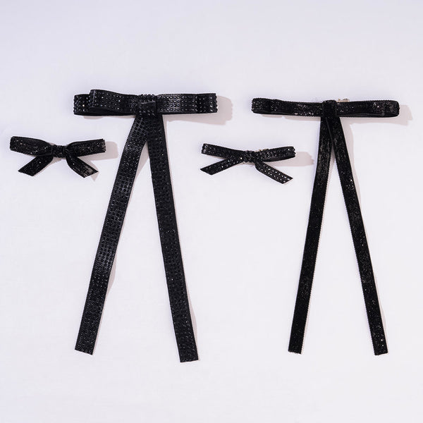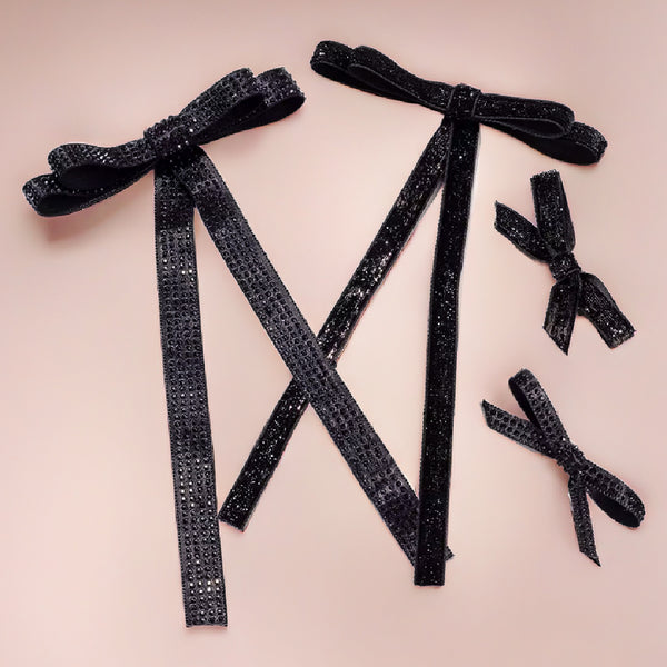 - Crafted with premium, soft-touch materials, these satin & glitter ribbon bows are gentle on your hair and are truly coquette-core. An all black set studded with crystals and glitter, they are perfect for mixing and matching with your fits. Whether you're rocking a high ponytail, a chic bun, or playful pigtails, our ribbon bow clip will keep you looking fabulous all day long.