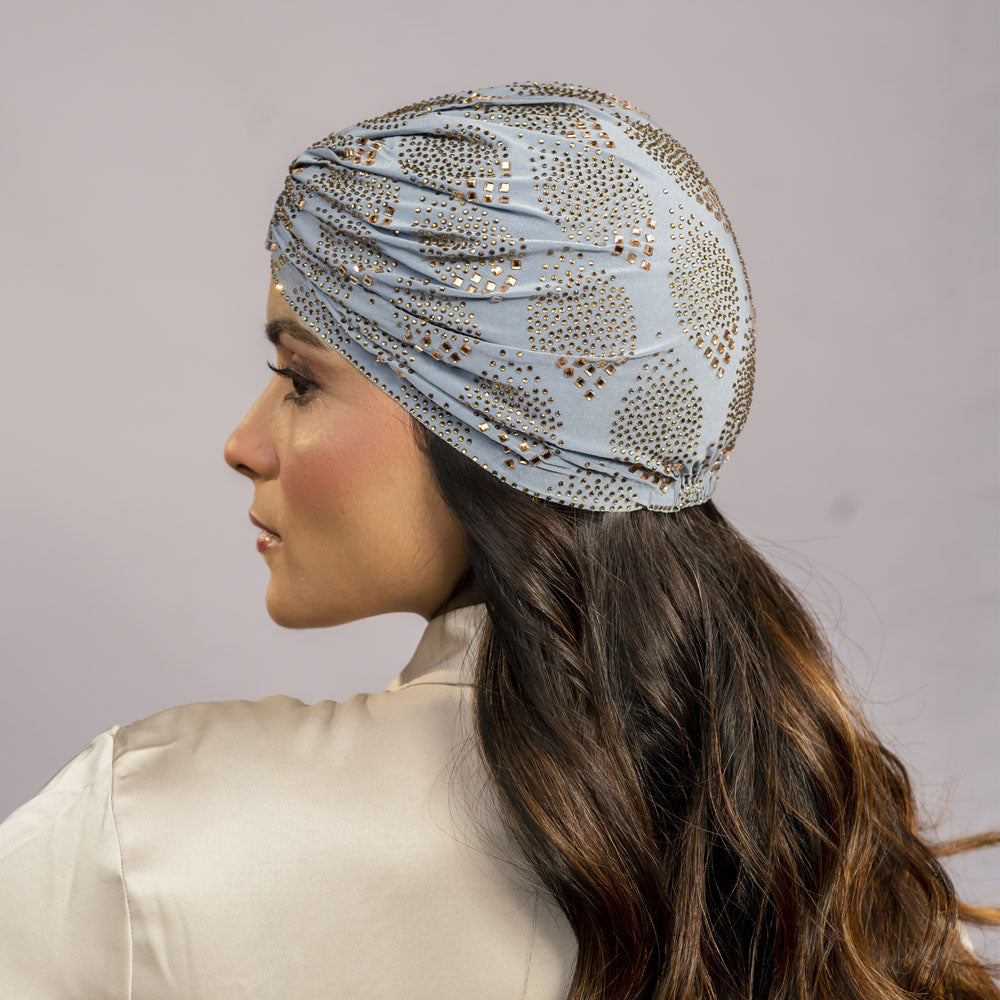 Fabric Color - Blue-grey Fabric Type - Lycra Material Color - Gold Material Type - Rhinestones A glam Turban with silver crystals in a geometric design Comfortable to wear One size fits all Wear it on your vacations, brunches or...