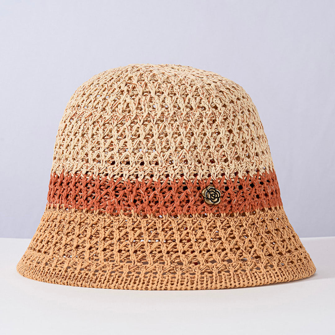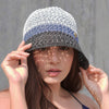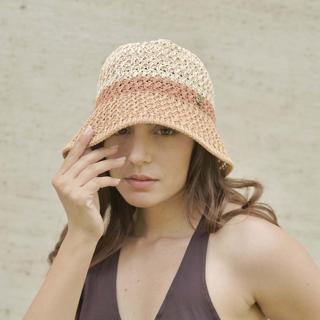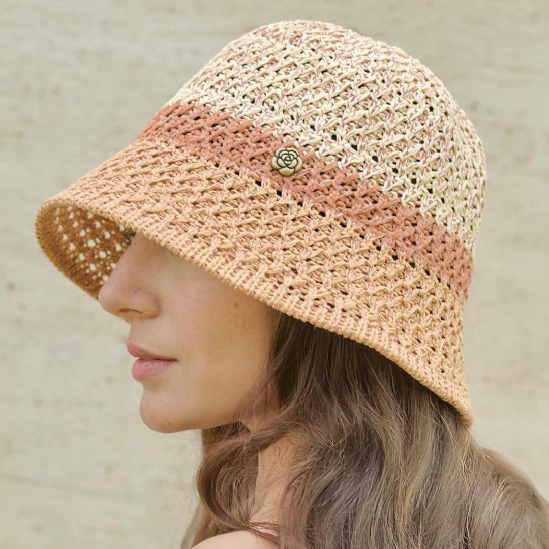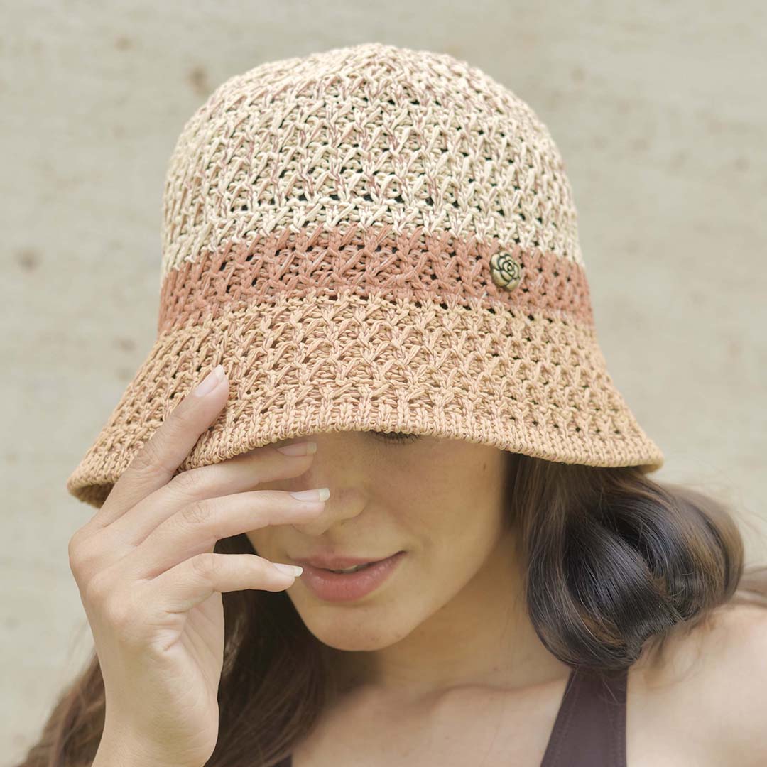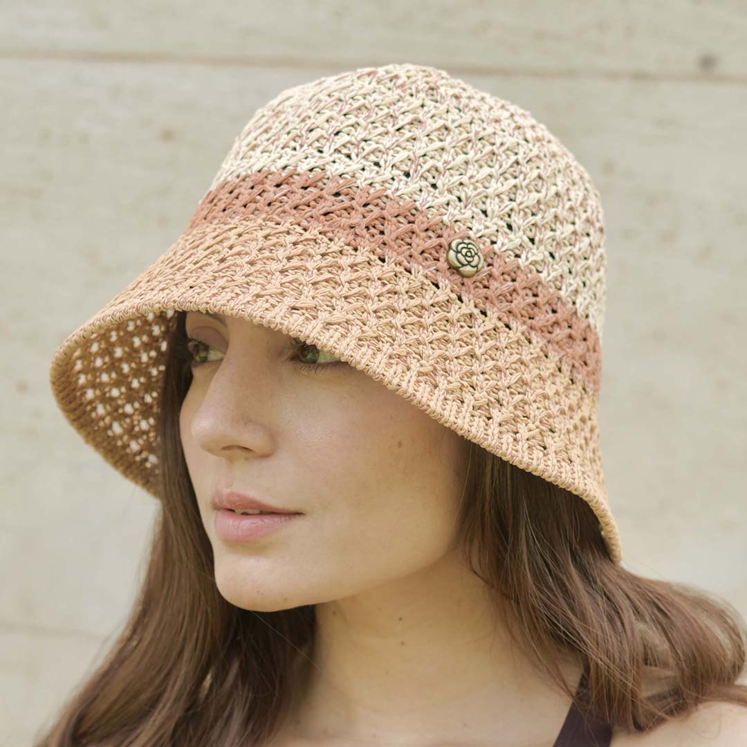 Crochet Beach Bucket Hat with Rose Charm - Shades of Beige