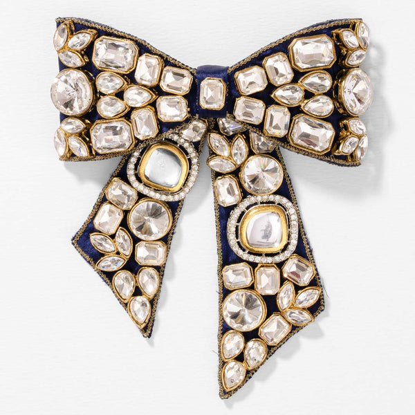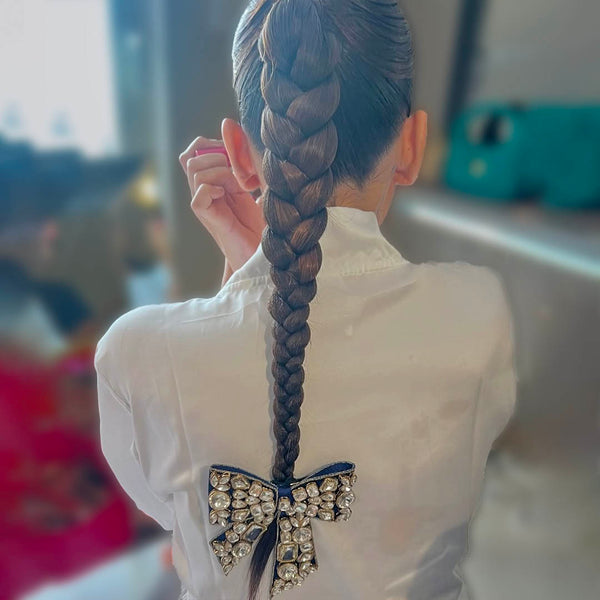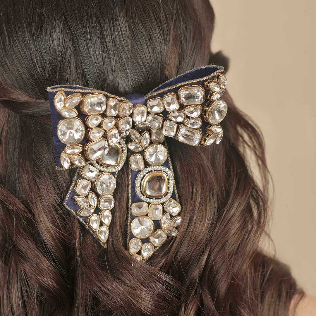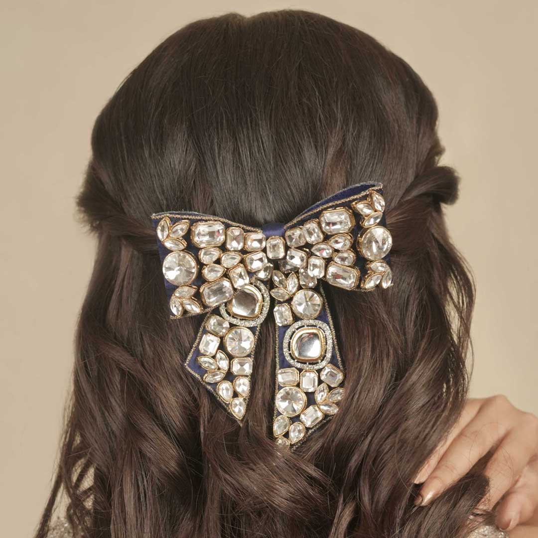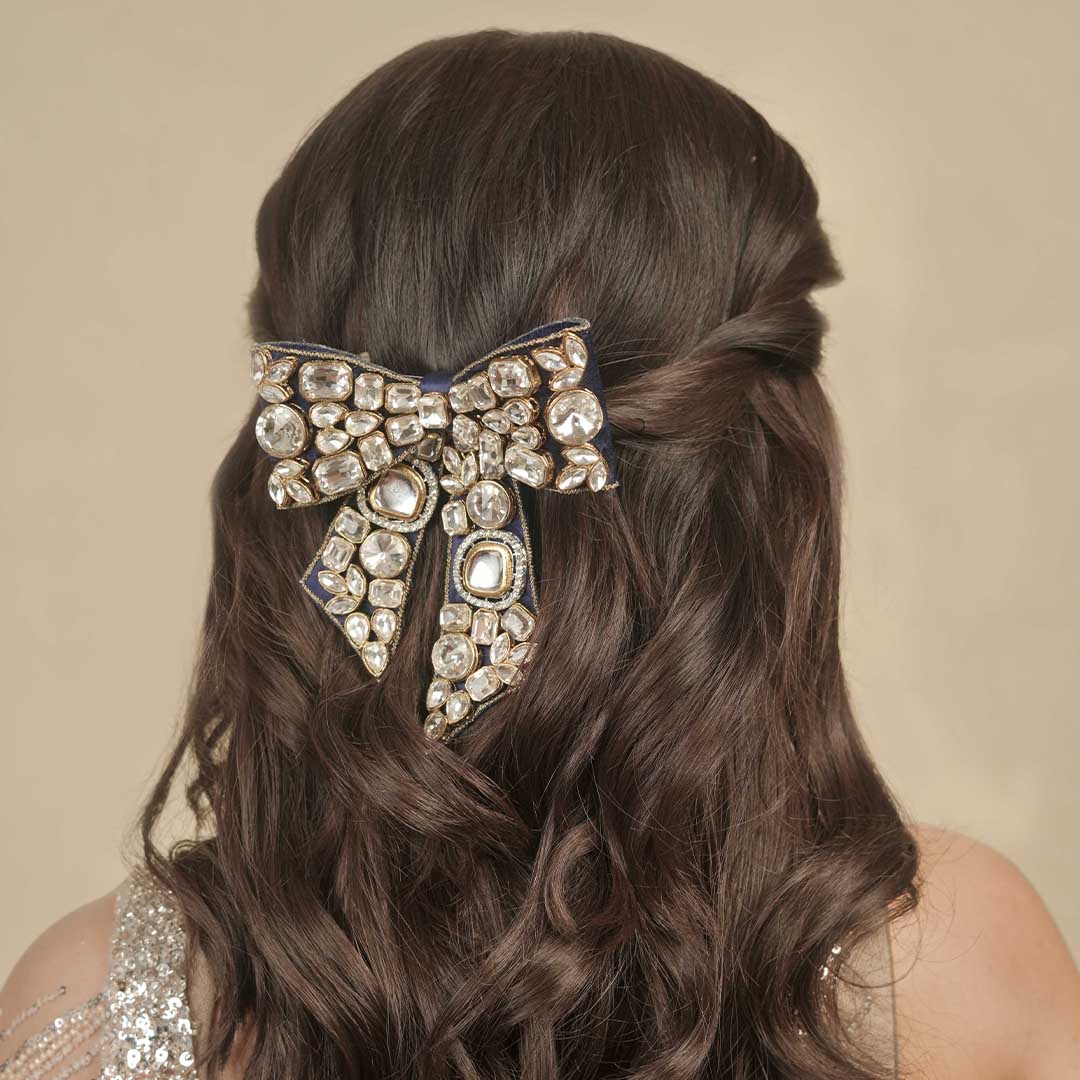 Meticulously handcrafted with sparkling Kundan stones, this luxurious hair bow blends traditional Indian craftsmanship with a modern aesthetic. Designed to elevate bridal, festive, or occasion wear, this glamorous bow clip adds instant elegance to any hairstyle.
