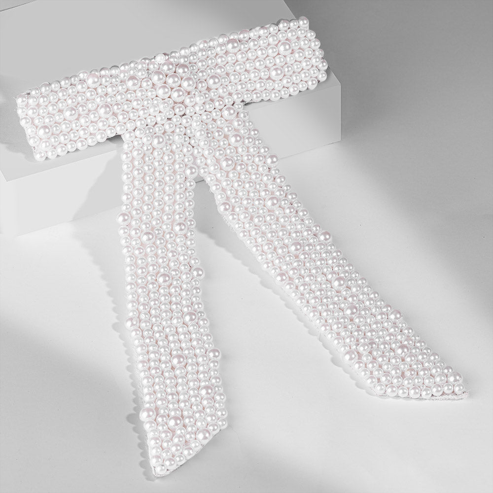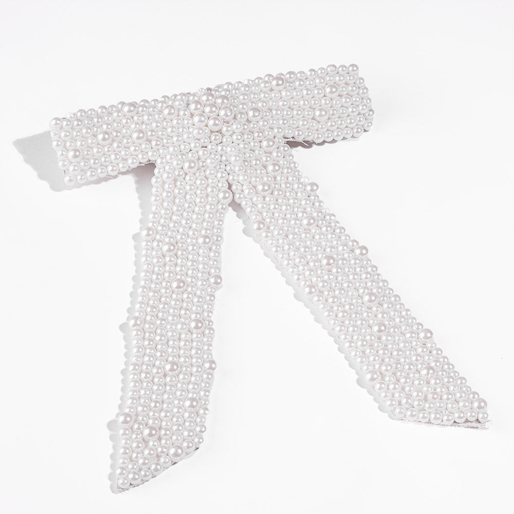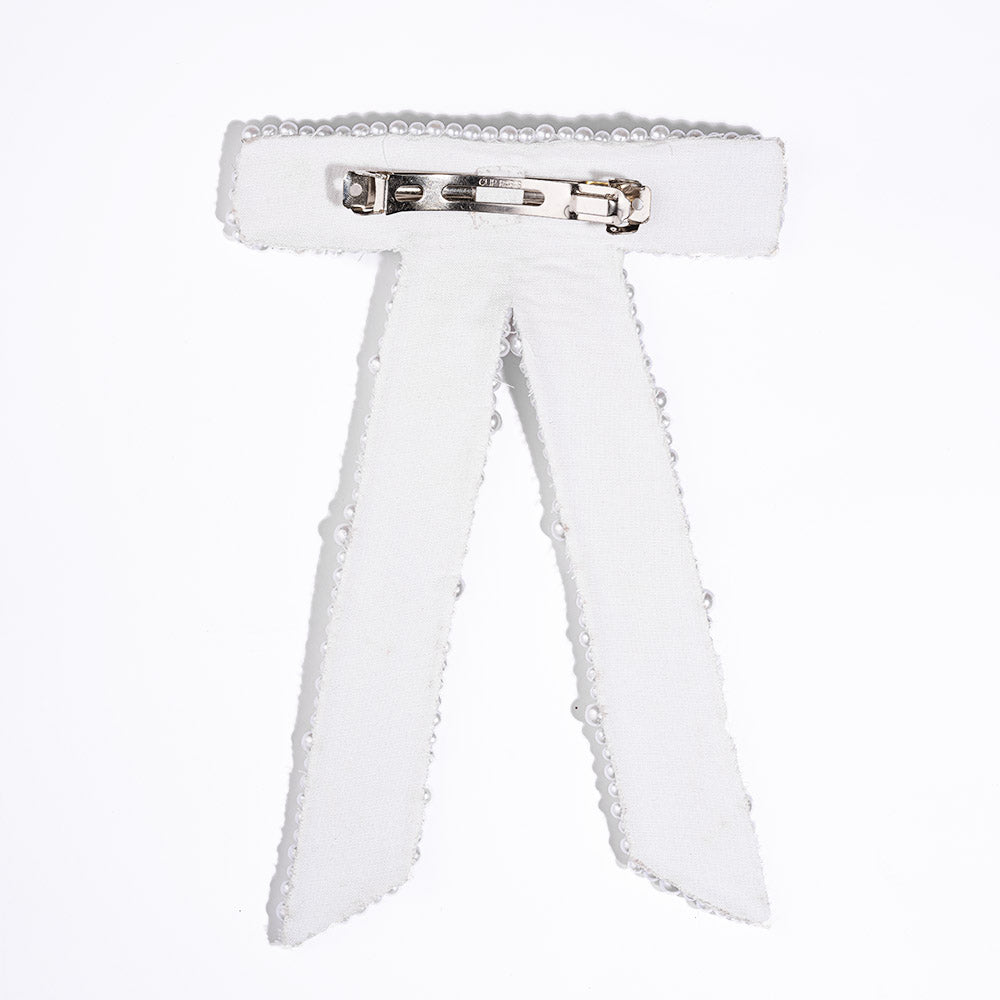 - Indulge in luxury and style with our Embellished Pearl Hair Bow Barrette Clip. Handcrafted with precision and attention to detail, this exquisite accessory is designed to capture the essence of sophistication and elegance. Embellished with sparkling crystals and pearls, this hair bow clip adds a touch of glamour to any look, whether you're attending a special event or a wedding.