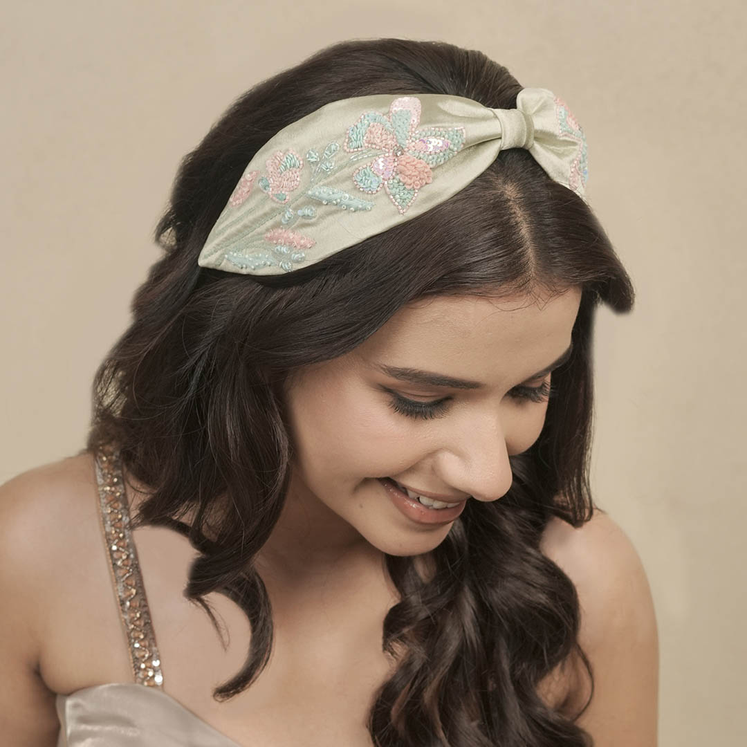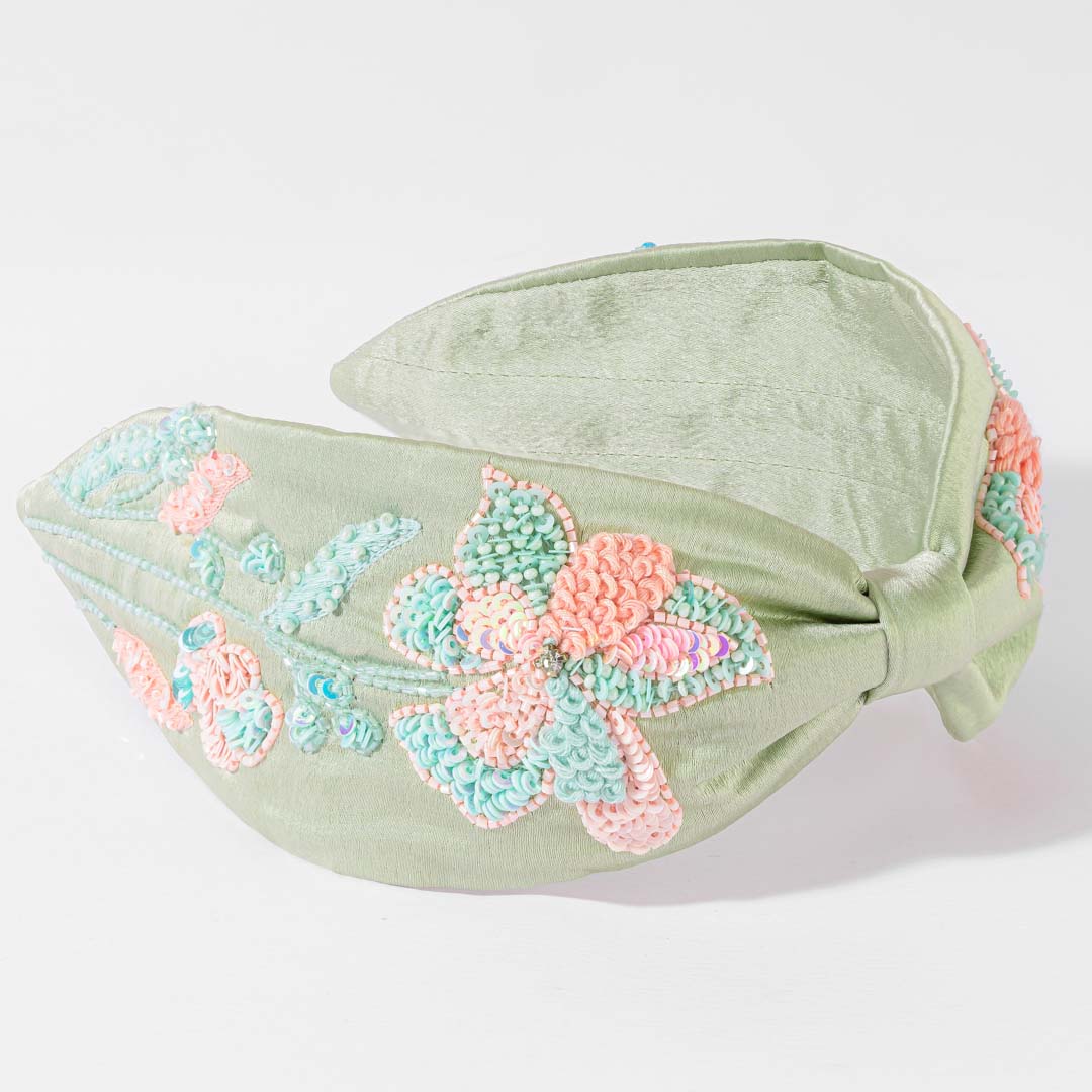 Flora Embellished Knotted Hair Band - SageGreen headband with floral embroidery on a light gray backgroundFlora Embellished Knotted Hair Band - SageFlora Embellished Knotted Hair Band - SageFlora Embellished Knotted Hair Band - SageFlora Embellished Knotted Hair Band - SageFlora Embellished Knotted Hair Band - SageFlora Embellished Knotted Hair Band - Sage