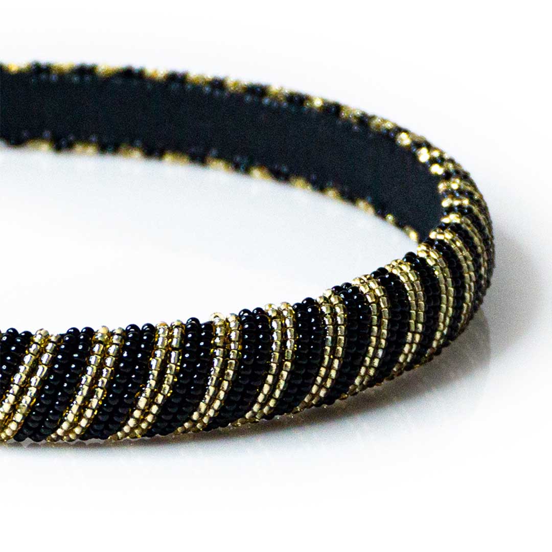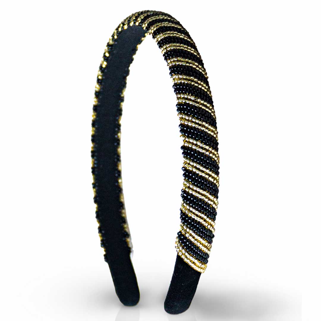 • The unique geometric design of this headband gives it a lot of personality. It seems like a sleek padded headband with pop of golden color.