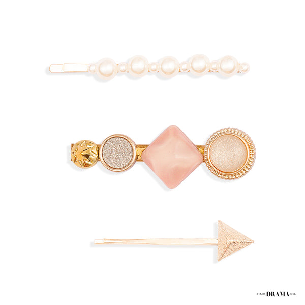 - Floral Knotted Hair Band - Pink & Peach & Pearls and Crystal Hair Pins - Set of 3 - Pink.