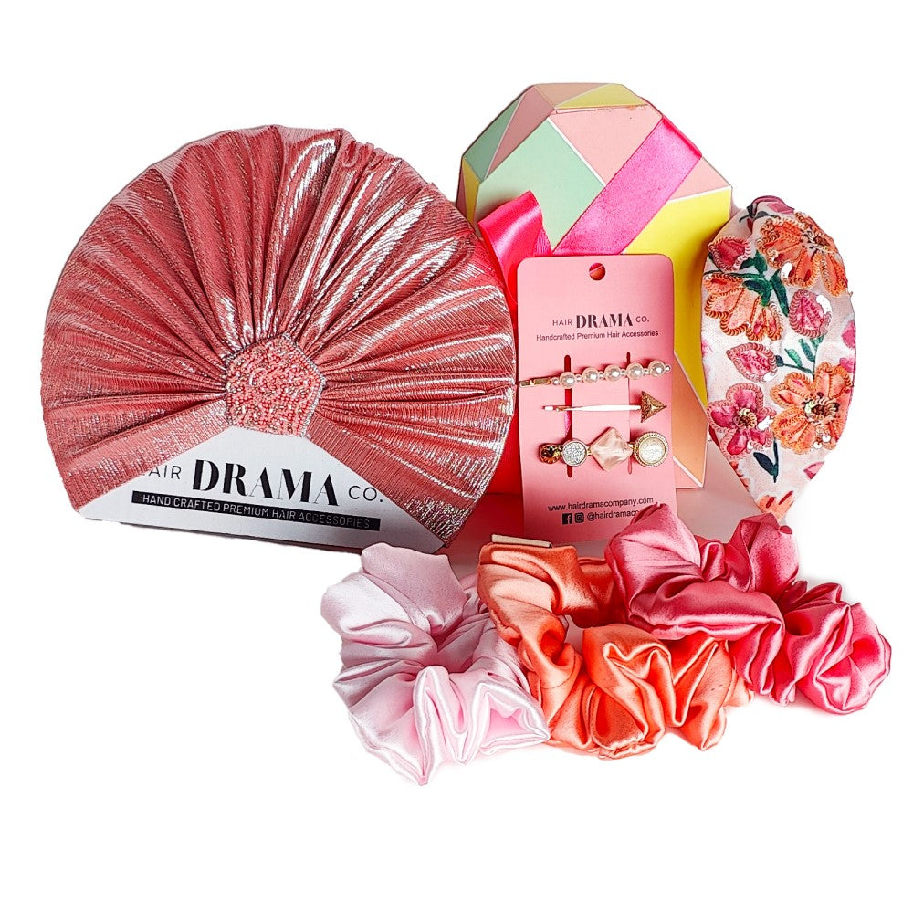 Glam Gift Box with 1 Knotted Hair Band, 1 Metallic Turban, 3 Scrunchies & 3 Hair Pins - Shades of Pink