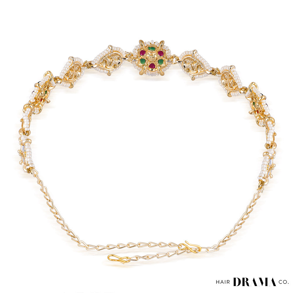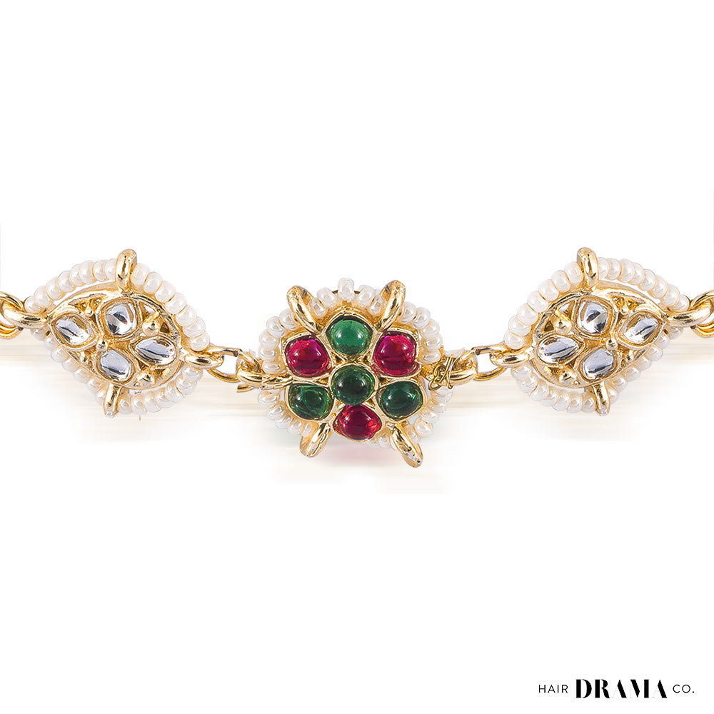 - A sophisticated hair band made of gold and accented with pearls and red, white and green polki.