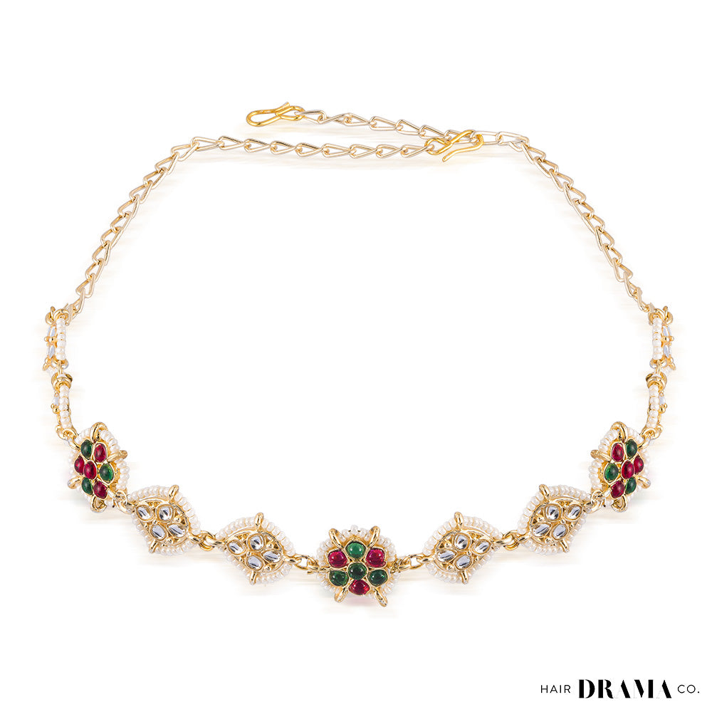 Gold Plated Hair Band for Women with Pearls and Polki - Red, White and Green