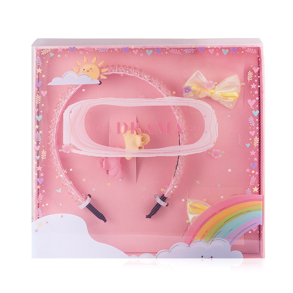 - This is our Party themed Gift Box which contains 1 Beaded Hair Band in pink color, 2 multi-colored Mini Clamps and 2 multi-color Hair Ties.