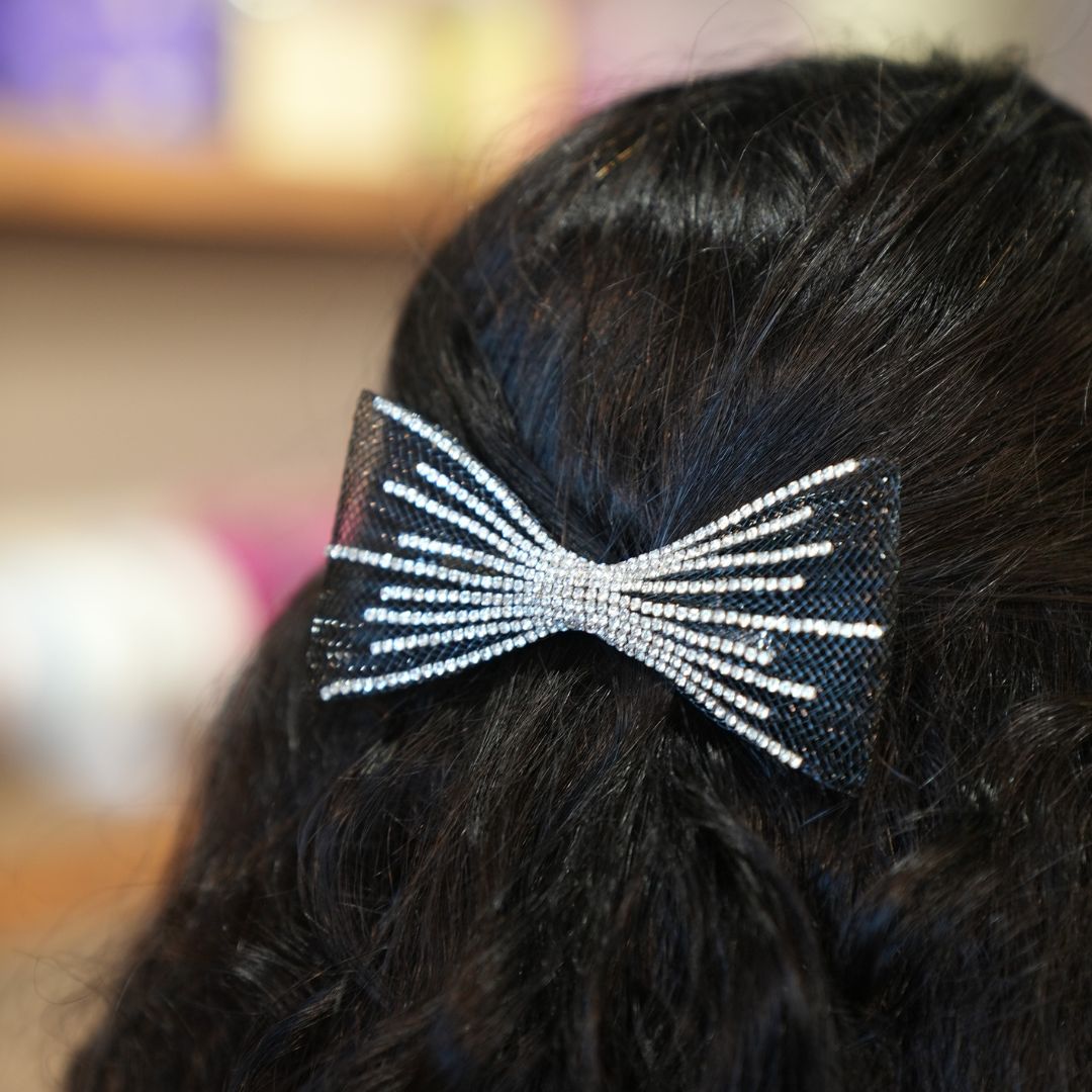 Enhance your look with a dash of timeless elegance by accessorizing with our Crystal Mesh Hair Bow from our HDC x Emily in Paris Collection. Handcrafted and adorned with shimmering crystals, this hair accessory offers a touch of glamour that's perfect for any occasion. Whether you're dressing up for a special event or adding a pop of sparkle to your everyday style, this bow will surely become a favorite accessory in your collection.