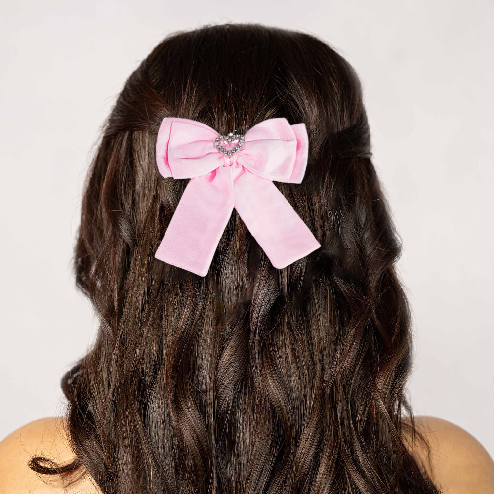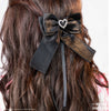 - Want to add a touch of Parisian glamour to your outfits? Elevate any look with this stunning black satin bow hair clip, complete with a shimmering silver crystal heart charm.