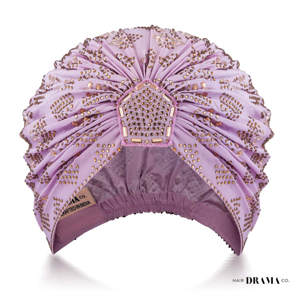 Fabric Color - Lilac Fabric Type - Lycra Material Color - Gold Material Type - Rhinestones A glam Turban with silver crystals in a geometric design Comfortable to wear One size fits all Wear it on your vacations, brunches or...