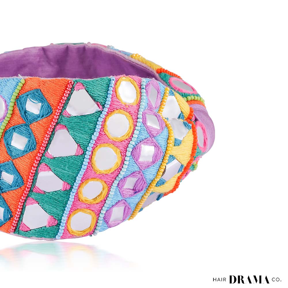 This knotted headband is the perfect hair accessory with hand embroidered mirrorwork to take your ethnic look up a notch.