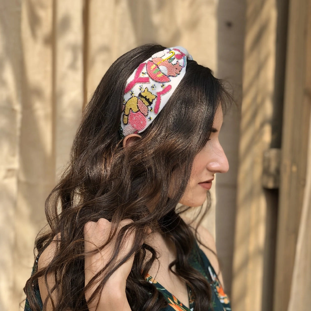 Size - Small: For 10 years and below Medium: For 11 years and above Fabric Color: White Material Color: Multi Color Thread and Beads Key Features: This knotted headband is from our collection about the...