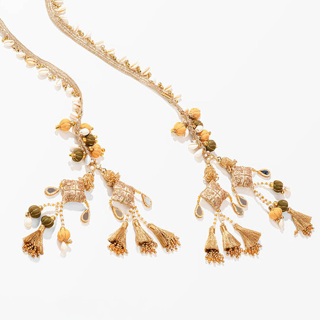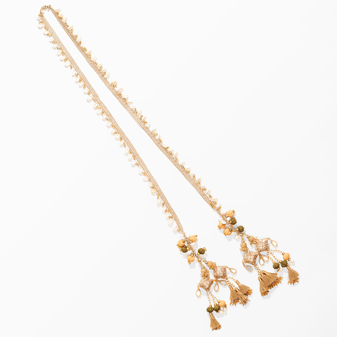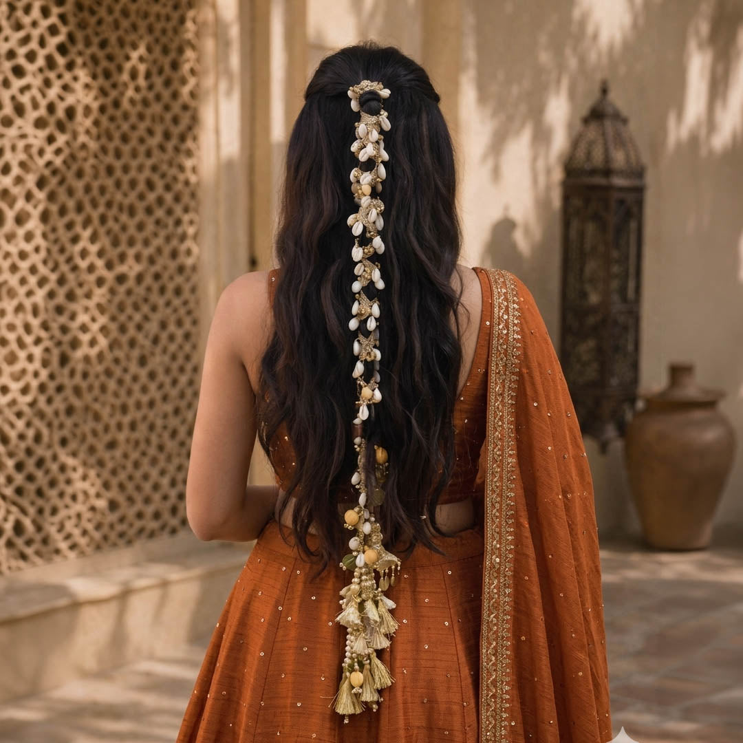 Lightweight and easy to tie at the base of your braid, it falls seamlessly along the length of your plait. Style it with a classic long braid for a traditional finish, a fishtail for added texture, or a slightly loosened braid with soft face-framing strands for a more contemporary feel. The mix of elements adds subtle sound and movement, making it especially striking for haldi, mehendi, and daytime celebrations.