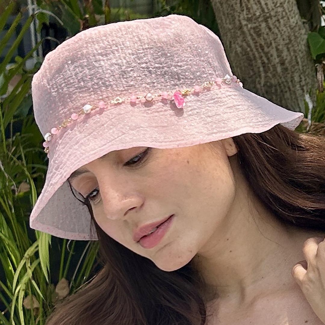 Step into the Barbie's world with this Pink Organza Bucket Hat with Pearl Charm Chain — a must-have from our exclusive Barbie collection. Light, luxe, and laced with signature Barbie sparkle, this hat brings dreamy glamour to sunny days, vacations, and everything in between. Crafted in sheer blush organza, it's breezy and beautiful, just like your favorite doll’s most iconic looks.