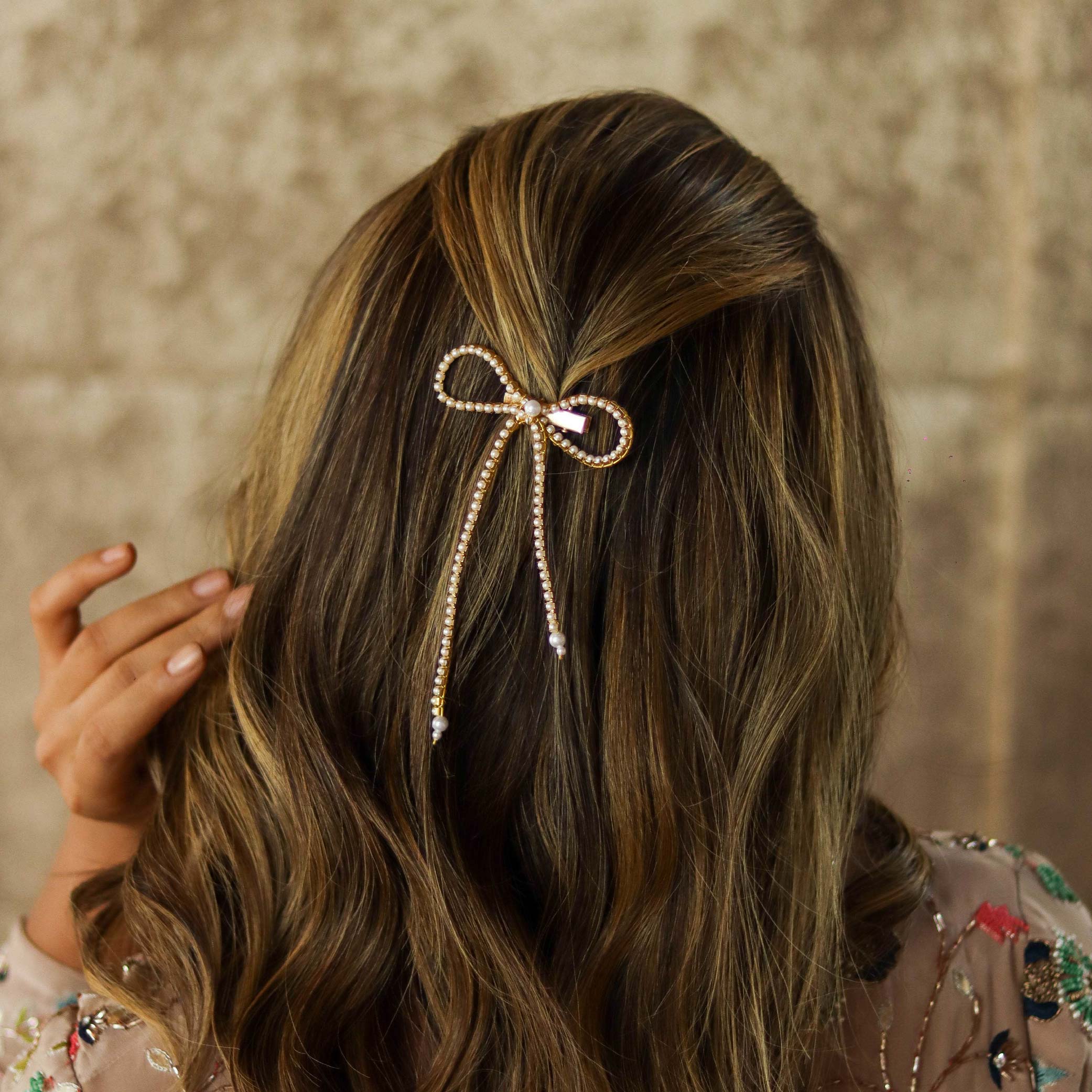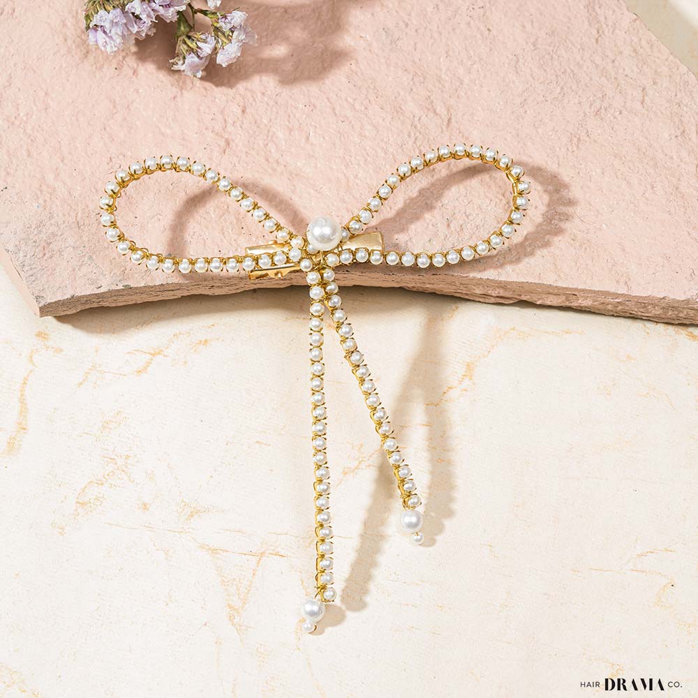 - This hair accessory is perfect for your wedding hair looks! A pearl-studded Hair Bow that is easy to wear and looks good with any outfit!
