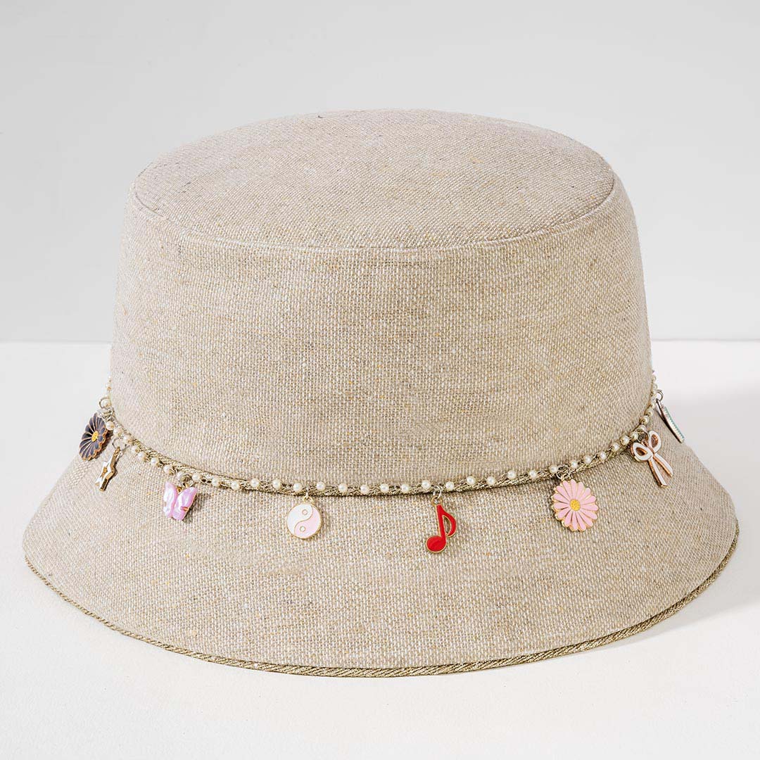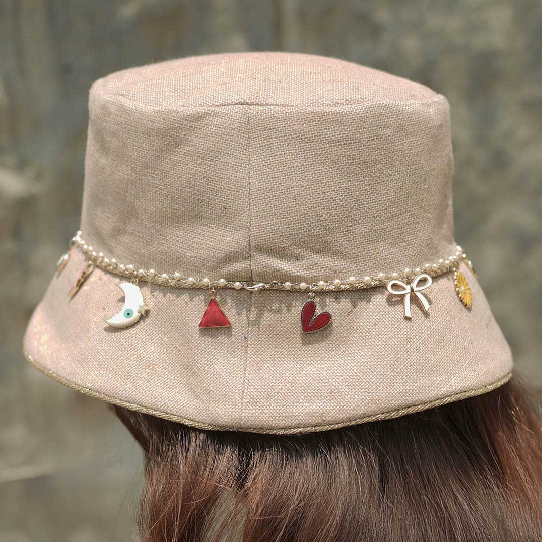Stay ahead of the trend with our Charm Cruise Bucket Hat – a must-have accessory that’s taking over the trend charts! Crafted from premium, sustainable jute fabric, this summer essential is equal parts earthy and edgy. Adorned with a sleek gold-tone chain featuring playful dangling charms, it brings just the right dose of glam to your off-duty look. Whether you’re heading to a beach brunch or styling your vacation ‘fit, this bucket hat is your ticket to effortless cool.