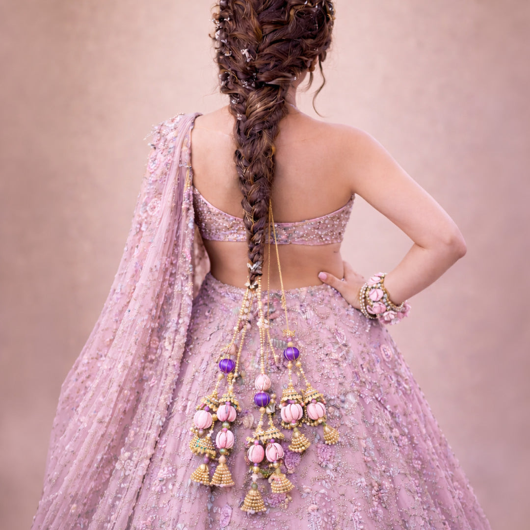 The Rivaa Crystal & Bead Parandi – Multicolour is made to bring your braid to life. With layers of crochet balls, crystals, pearls, tassels, and ghungroos in pink, purple, and gold tones, it adds depth, movement, and a richly detailed finish that stands out with every step.