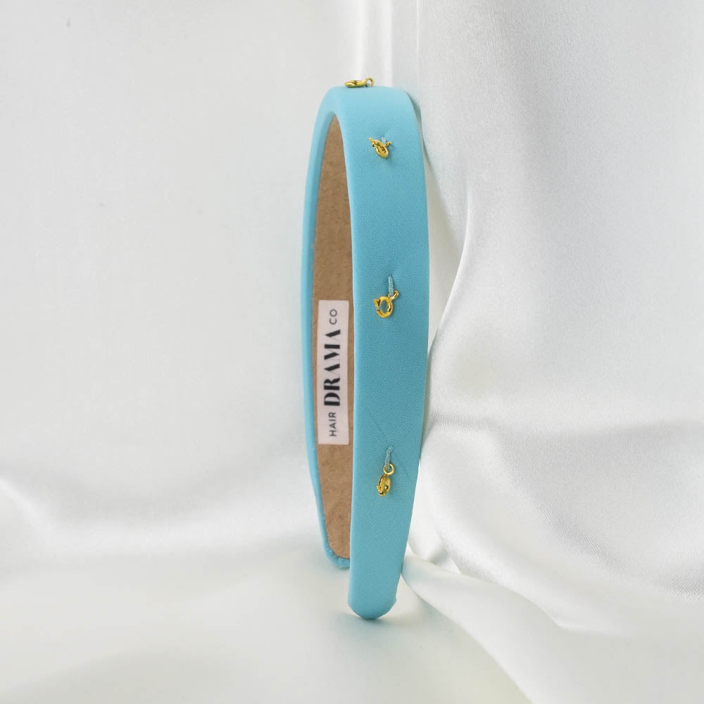 A sleek and stylish puff hair band in sky blue color featuring 8 loops. Personalise it with charms to create a piece that’s uniquely yours.