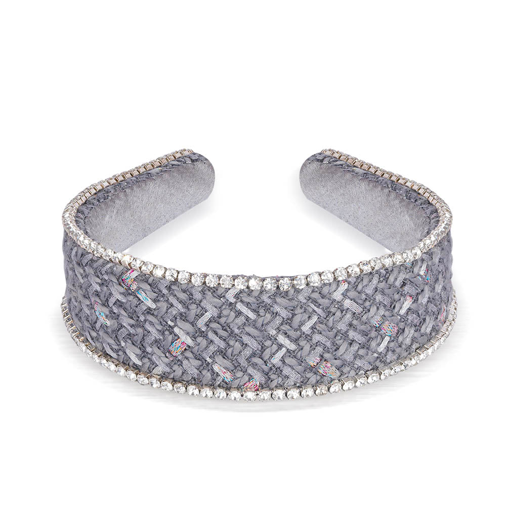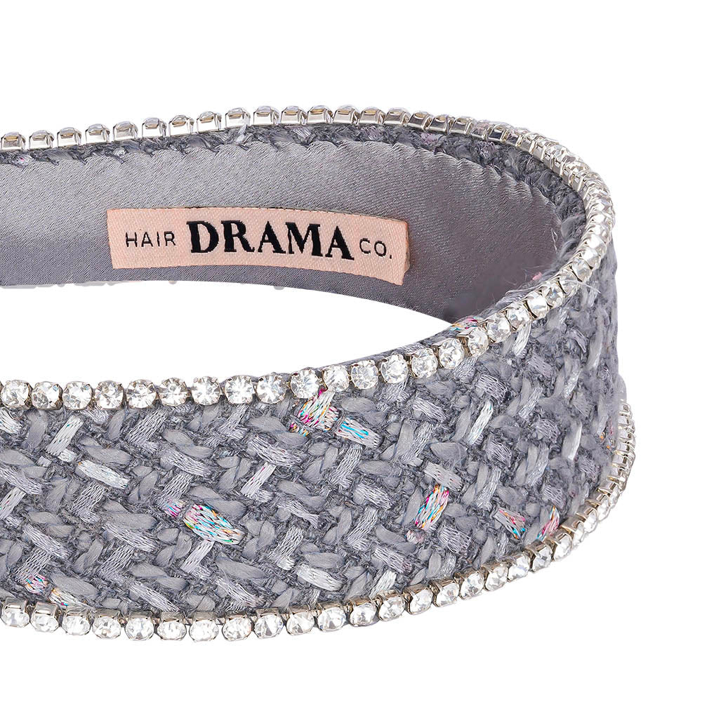 - Our tweed crystal headband oozes a very chic and glam vibe in neutral grey color, making it the trendiest headband this season.