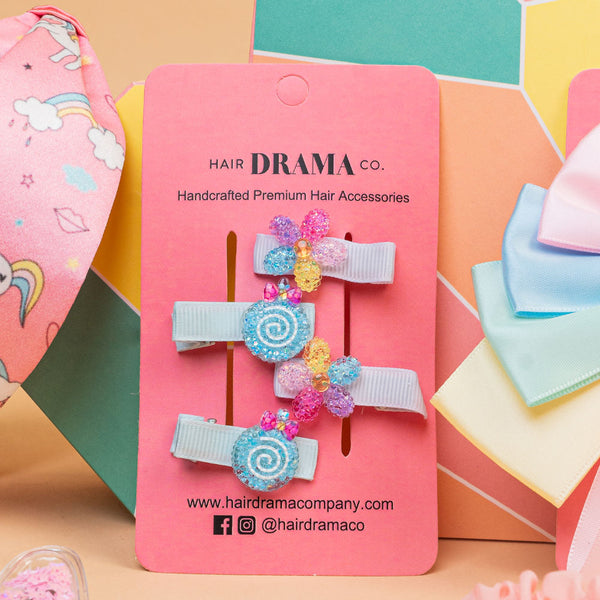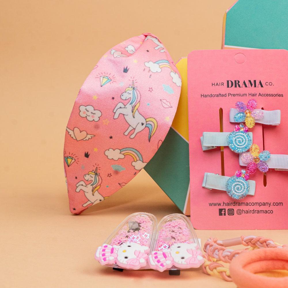 This gift box contains hair accessory from our Hair Drama Co.'s Kids Unicorn Collection. This gift box is perfect as gifts for all the little divas and are so comfortable that they would want to wear it all day! This set contains 1 knotted hair band, 1 ribbon hair bow, 6 assorted hair clips and 6 assorted scrunchies. Be a trendsetter with this gift set!